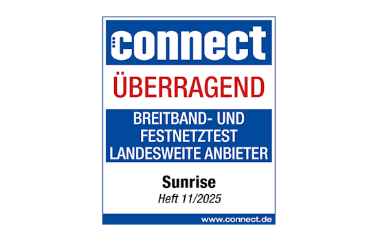Sunrise wurde im aktuellen connect Breitbandtest 2025 erneut mit der selten vergebenen Höchstnote «überragend» ausgezeichnet und das bereits zum vierten Mal in Folge! Damit bestätigen wir unsere starke Position und konnten uns auf hohem Niveau nochmals deutlich verbessern.