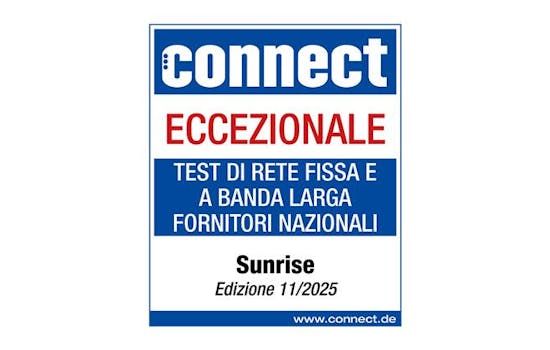 Sunrise è stata nuovamente premiata nel test a banda larga 2025 di connect con il massimo punteggio, raramente assegnato, di «eccezionale» – per la quarta volta di seguito! Confermiamo così la nostra forte posizione e siamo riusciti a migliorarci ulteriormente a un livello già molto alto.
